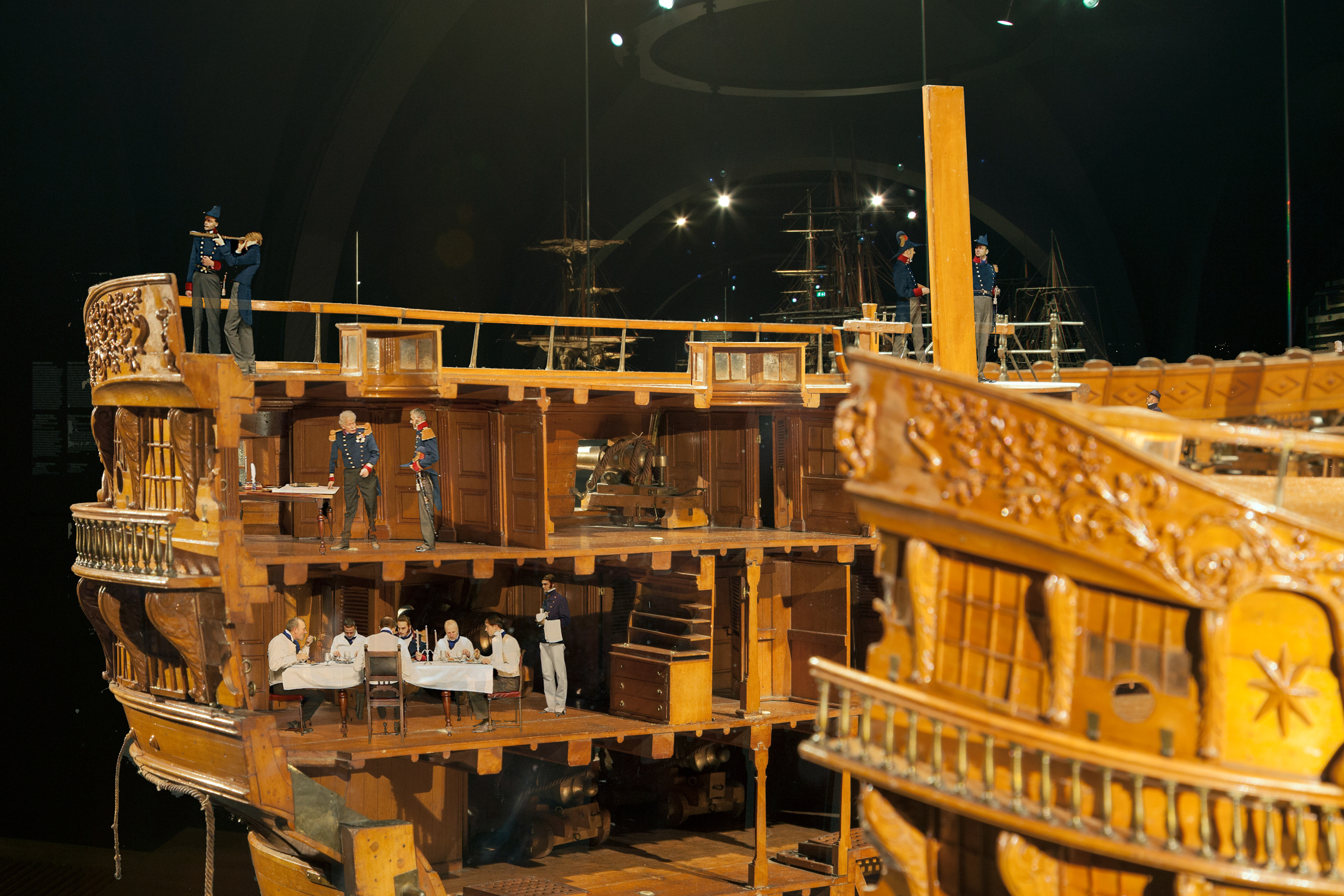 The Neptunus is a half model of a liner of the Dutch Royal Navy. In this exceptionally detailed model that shows both the exterior and interior of the ship we show the daily life on board of this ship in 1835. For this project we developed the old Pepper’s ghost technique with an entirely new variant that made it possible to tell this stories inside this model with the most respect for this beautiful piece of Marine collection and for the new Marine Models Room. The model can simply be exhibited without concessions while still an additional informational layer can be added.